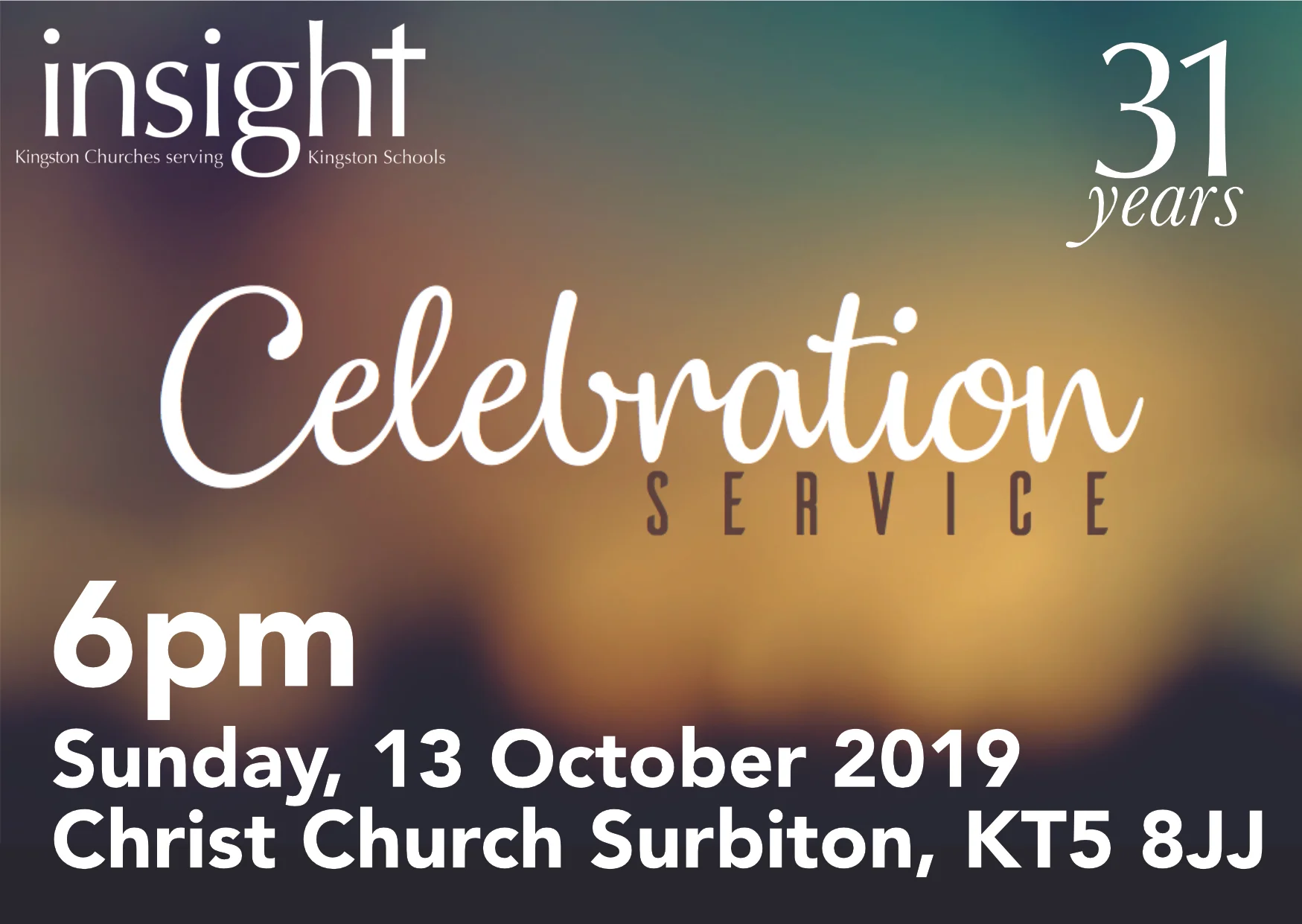 The Insight Team would like to invite you to the annual 'Celebration Service' on Sunday 13th October from 6pm at Christ Church Surbiton. This service is an opportunity to hear more about the work of Insight, to pray with others about the work and to meet others involved in Insight, both as paid workers and as volunteers.